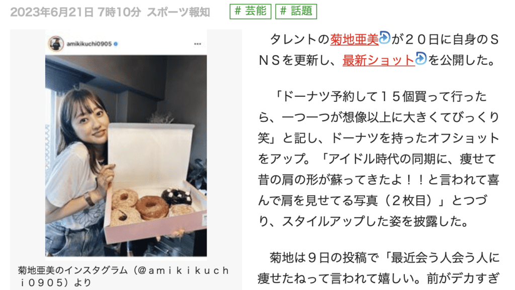この前、ネットニュースで菊地亜美さんが産後ダイエットに成功したようで記事が出ていました。