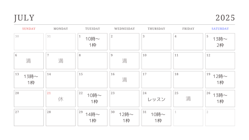 (こちらは6月27日現在の状況です。オンタイムでの予約状況は公式LINEの「新たに予約する」ボタンからご確認いただけます。)