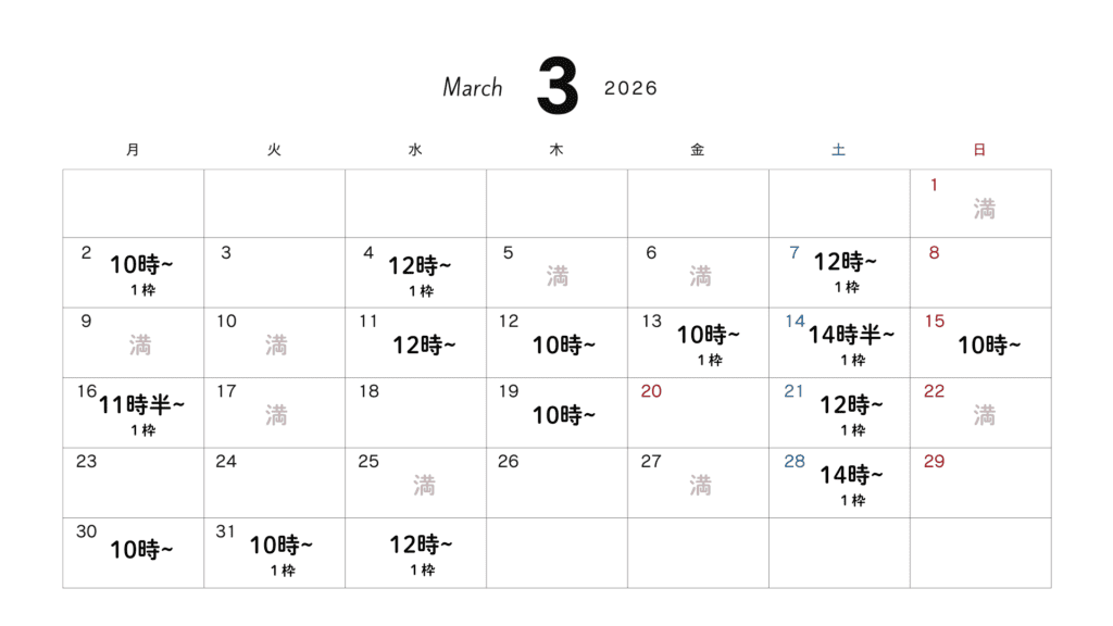 (こちらは2月27日現在の状況です。オンタイムでの予約状況は公式LINEの「新たに予約する」ボタンからご確認いただけます。)