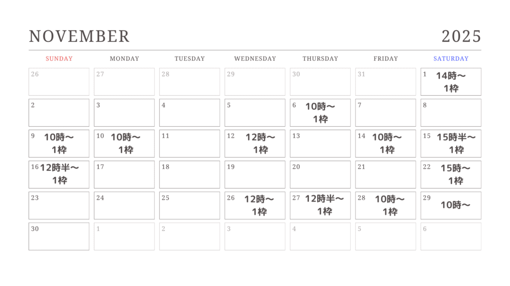 (こちらは10月31日現在の状況です。オンタイムでの予約状況は公式LINEの「新たに予約する」ボタンからご確認いただけます。)