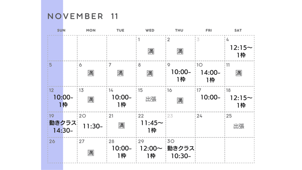 - 今月の日曜日の空きは12日10時〜1枠空きがあります。
