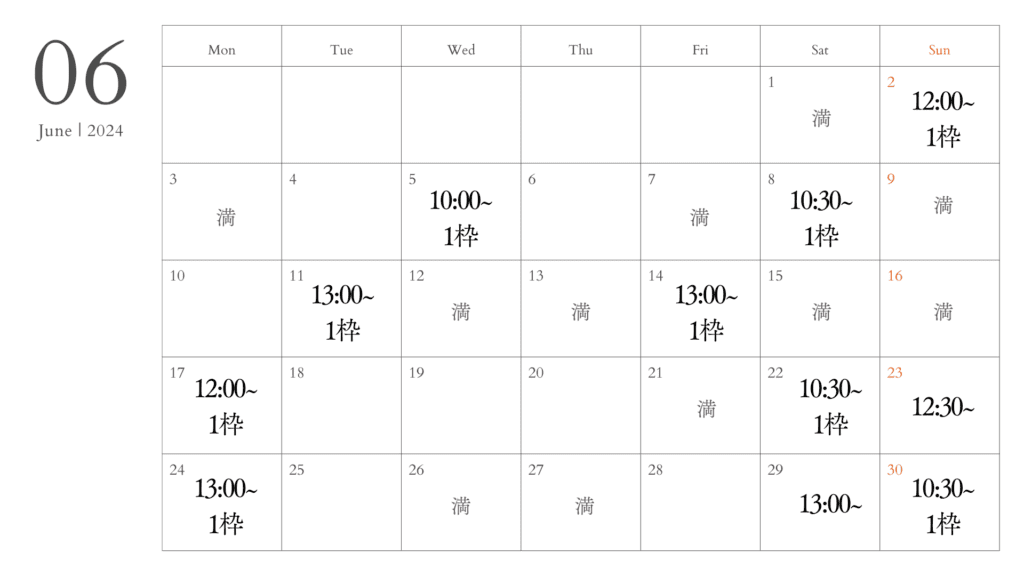 (こちらは5月31日現在の状況です。オンタイムでの予約状況は公式LINEの「新たに予約する」ボタンからご確認いただけます。)
